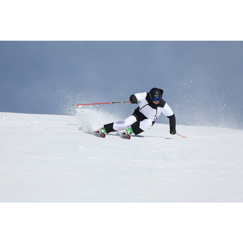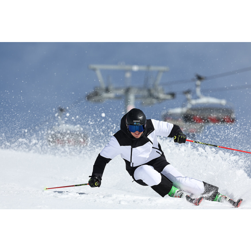 RINO – eine moderne Skijacke aus innovativen Materialien mit attraktivem asymmetrischem Design und seitlichem Frontreißverschluss, entwickelt für alle, die auf der Piste auffallen möchten.